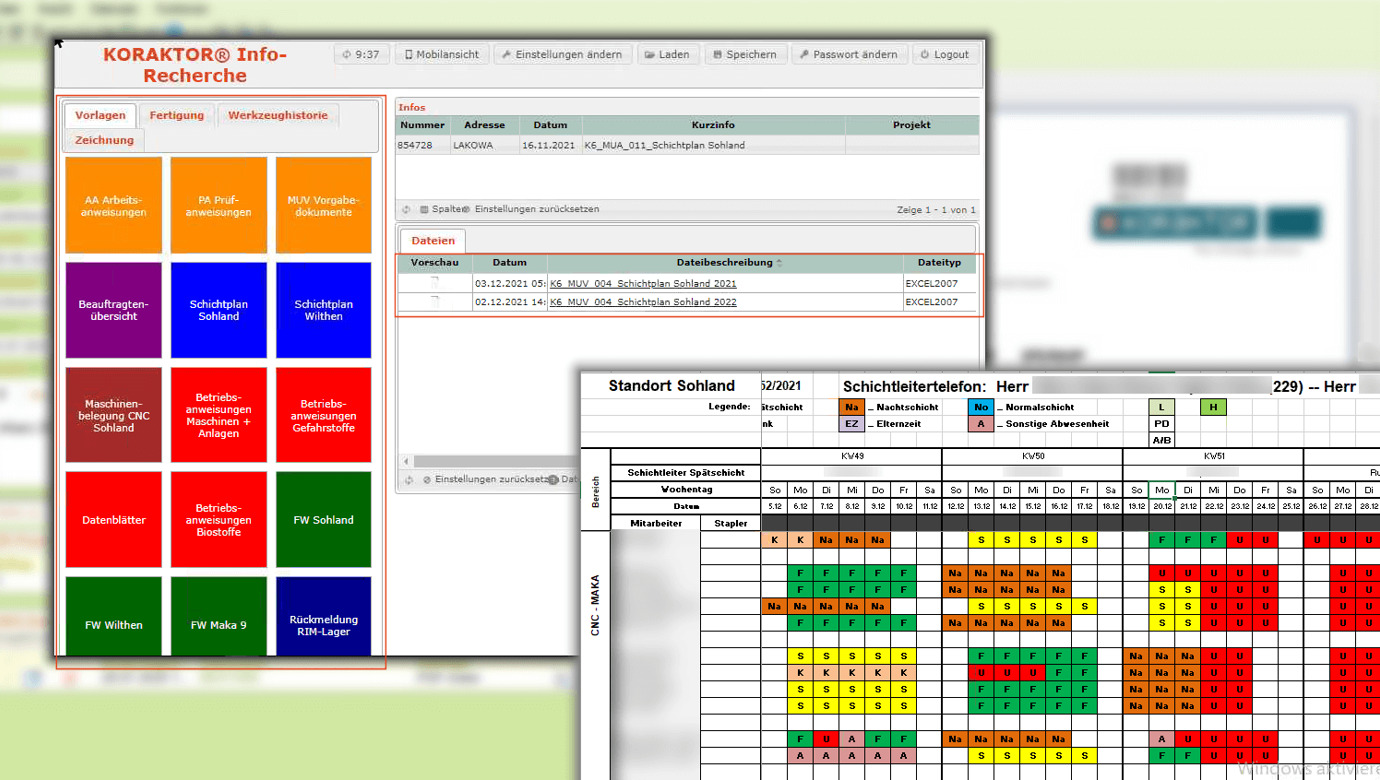 Die für die Recherche extra aufgestellten PC's stellen den Zugriff auf die Informationen rund um die Uhr sicher. Mitarbeiter aus der Fertigung, die keinen Account für den Firmen-KORAKTOR® oder das ERP-System DELECO haben, können über die App alle benötigten Daten zu Artikeln, Werkzeugen oder Dokumenten für die Montage oder die Formerei erhalten. Nun stehen auch Schichtpläne online zur Verfügung und das bringt folgende Vorteile: