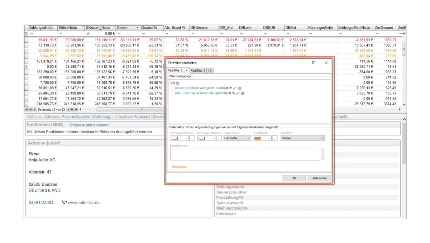 Die Auswertungslisten geben einen schnellen Überblick über komplexe Unternehmensprozesse und ermöglichen eine schnelle Reaktion, auch bei umfangreichen Projekten.