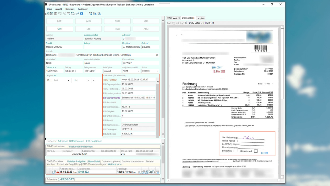Auf den neu angeschafften Touchscreen-Monitoren erfolgt nun die Bearbeitung schnell und eigentlich wie gewohnt auf Papier mit Stift. Die Bauleiter nehmen so Korrekturen und Vermerke zur Kostenstelle vor. In einer Erfassungsmaske übernimmt der Verantwortliche Rechnungsdatum, Betrag, Mitarbeiter und Kurztext. Anhand dieser Eckdaten rechnet KORAKTOR® weitere Werte, z.B. die Skontowerte und das Zahlungsdatum aus.