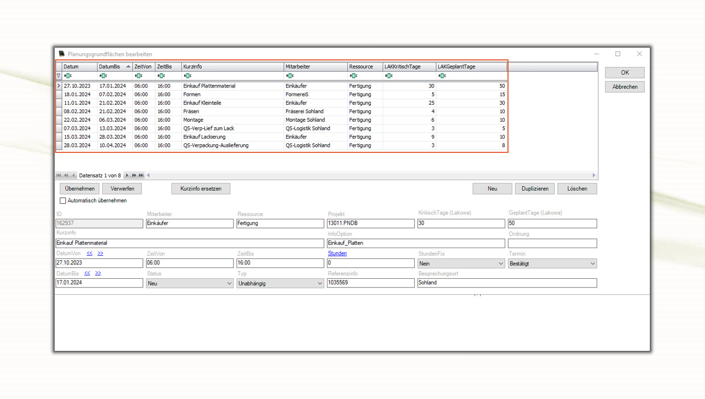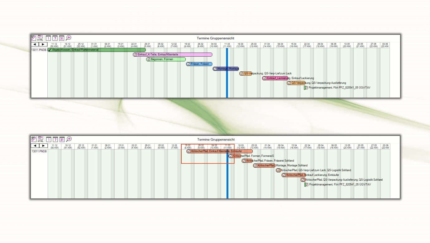Im Planungsassistenten fest hinterlegte Planungsvorlagen helfen, Produktionsabläufe schnell zu planen. Dabei wird der kritische Pfad automatisch für jeden Arbeitsschritt berechnet und mit eingeplant. Für den Mitarbeiter ist sofort ersichtlich, ob man den geplanten Liefertermin einhalten kann. Bei einer Umplanung oder Verschiebung des Liefertermins oder einzelner Arbeitsschritte erfolgt eine automatische Neuberechnung des kritischen Pfades für die noch offenen Aufgaben.