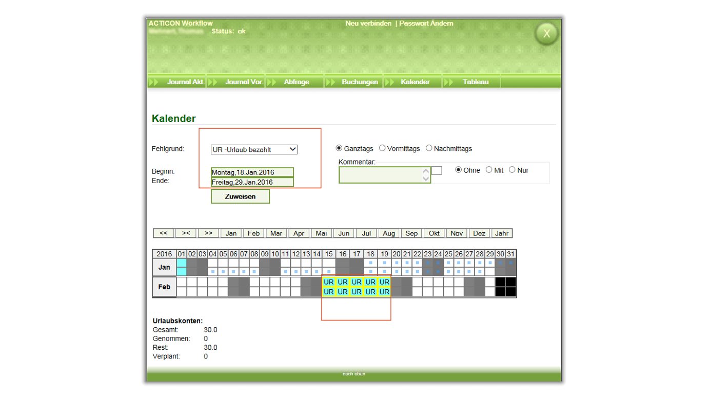 Darüber hinaus verfügt die Zeiterfassung über eine WEB-Oberfläche, über die neben den Zeitbuchungen auch ein Beantragungsworkflow realisiert ist.