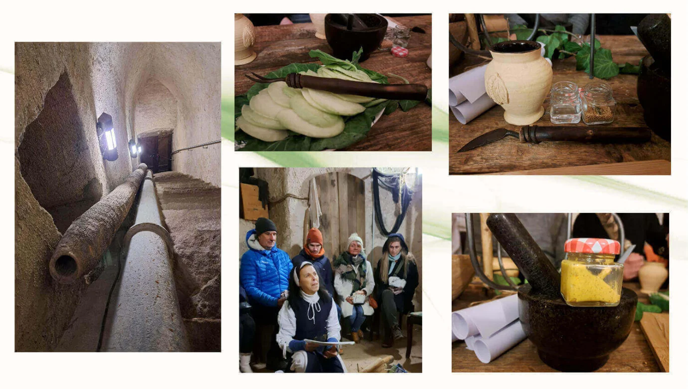 Einen weiteren Höhepunkt bildete der Rundgang durch die historische Anlage der neuen Wasserkunst sowie der Senfworkshop. Türmerin Gerlind wies uns in die Herstellung von Senf ein. Gerüstet mit einem selbst geschnürten Bündel mit Senfbrot, der eigenen Senfkreation, einem Buch mit Wissenswertem über Wasser und Senfherstellungsanleitung zogen wir weiter zum Mönchshof.