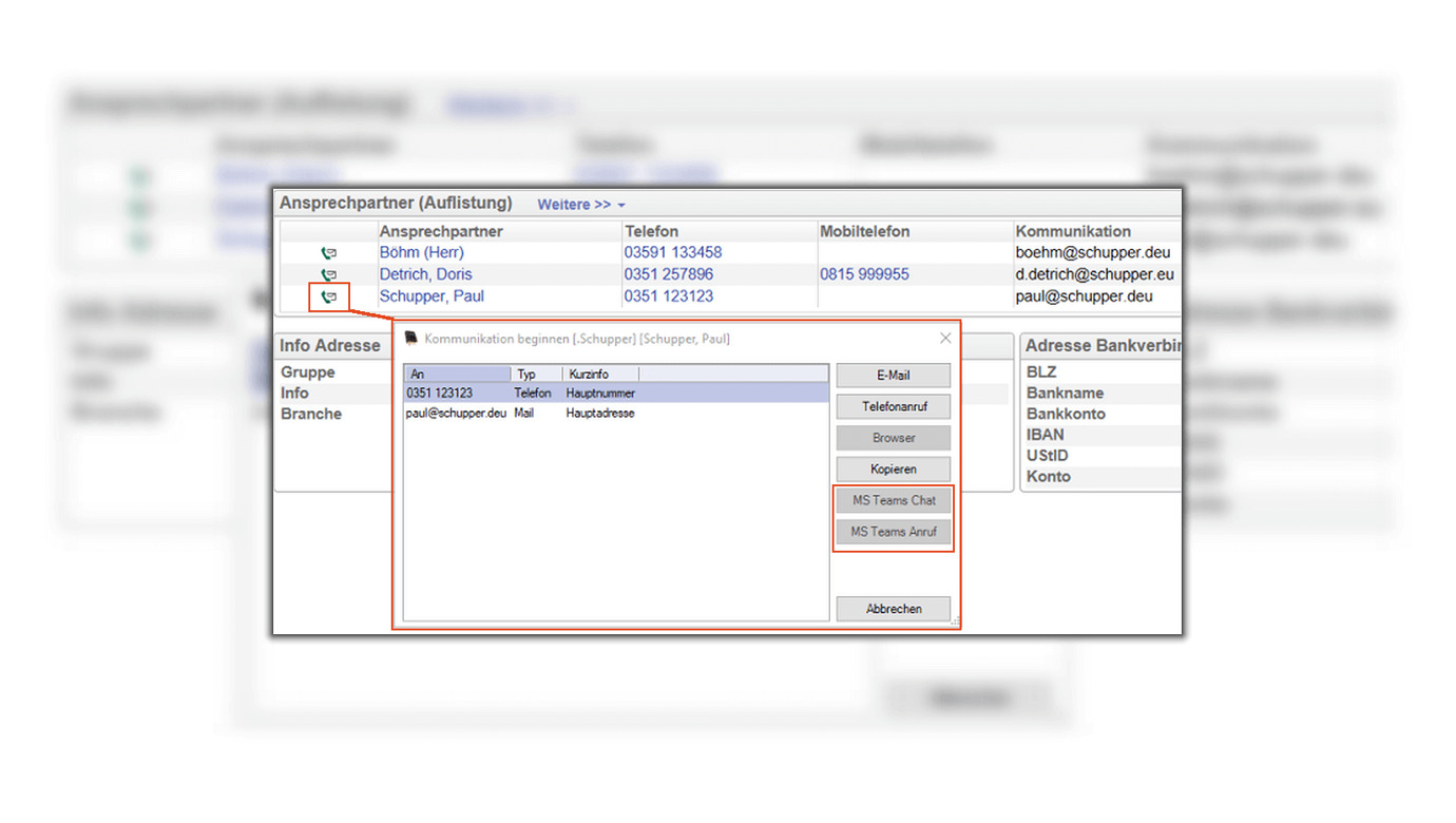 Microsoft Teams-Integration: Planen und starten Sie Besprechungen direkt mit KORAKTOR®-Kontakten – nahtlos verbunden mit Outlook.