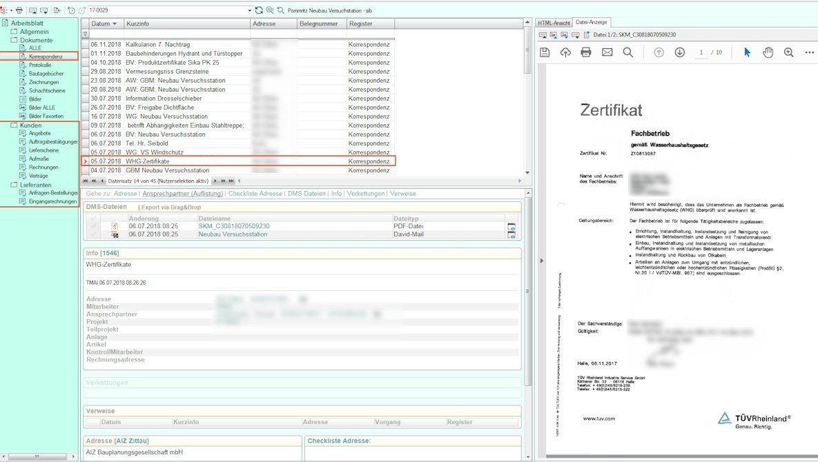 Die verschiedenen Firmen- und Auftragsunterlagen können nun zentral zum entsprechenden Sachverhalt oder Projekt verwaltet werden: