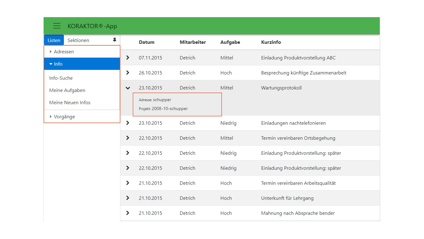 Mit dem Fokus auf eine mobile Verwaltung von Unternehmensdaten wird sich auf die wesentlichsten, aus KORAKTOR® bekannten Funktionalitäten konzentriert. D.h., es werden bereits bekannte Funktionalitäten aus der Info-Recherche umgesetzt und durch neue Funktionalitäten ergänzt: