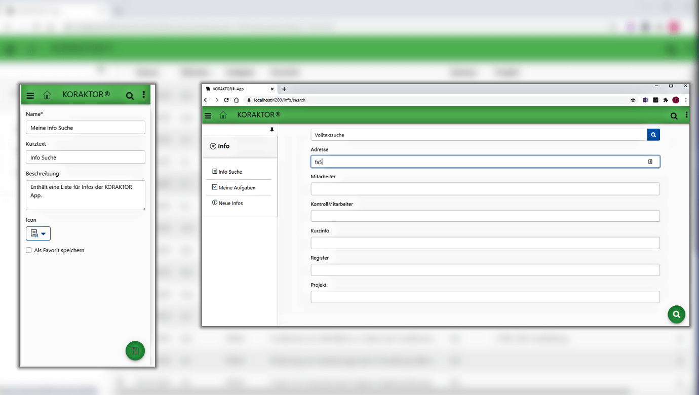 Mit der Neuentwicklung der KORAKTOR®-App entsteht ein Nachfolger der InfoRecherche. Sie konnte bereits über eine mobile Schnittstelle auf die im KORAKTOR® verwalteten Unternehmensdaten zugreifen. Jetzt ist es möglich, nicht nur die Daten zu lesen, sondern sie auch zu bearbeiten. Das erforderte eine komplette Neuentwicklung bekannter KORAKTOR®-Features mit dem Ziel: