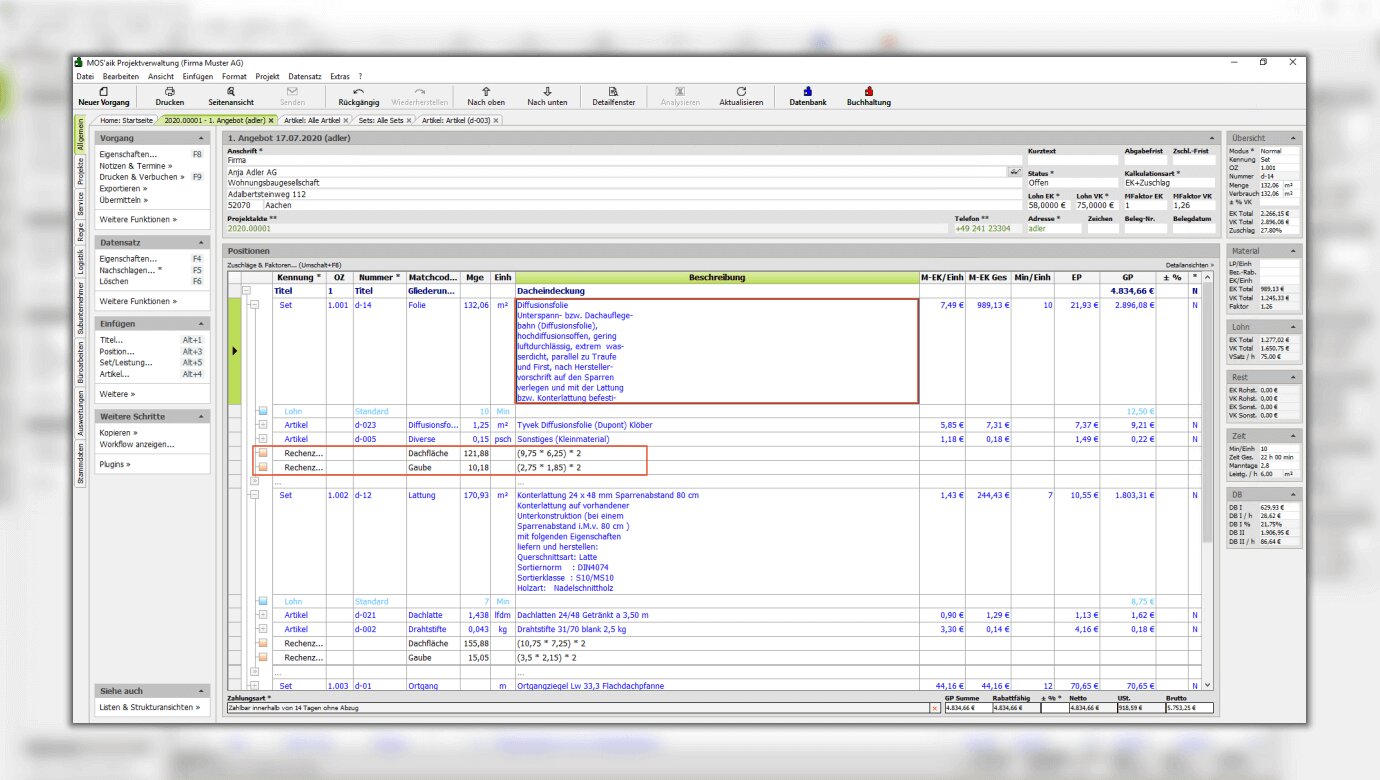 Angebote, Auftragsbestätigungen und Rechnungen sind mit Hilfe von vorgefertigten Bauteilen in MOS'aik schnell erstellt. Mit dem buchenden Druck wird das Dokument als PDF in der KORAKTOR® - Kunden- oder Projektakte archiviert. Die Mitarbeiter haben so eine schnelle Übersicht zu Informationen des Projektes und zur Auftragsbearbeitung, da beide Programme aufeinander abgestimmt sind. Außerdem erfolgt eine GoBD-konforme Ablage der Dokumente.