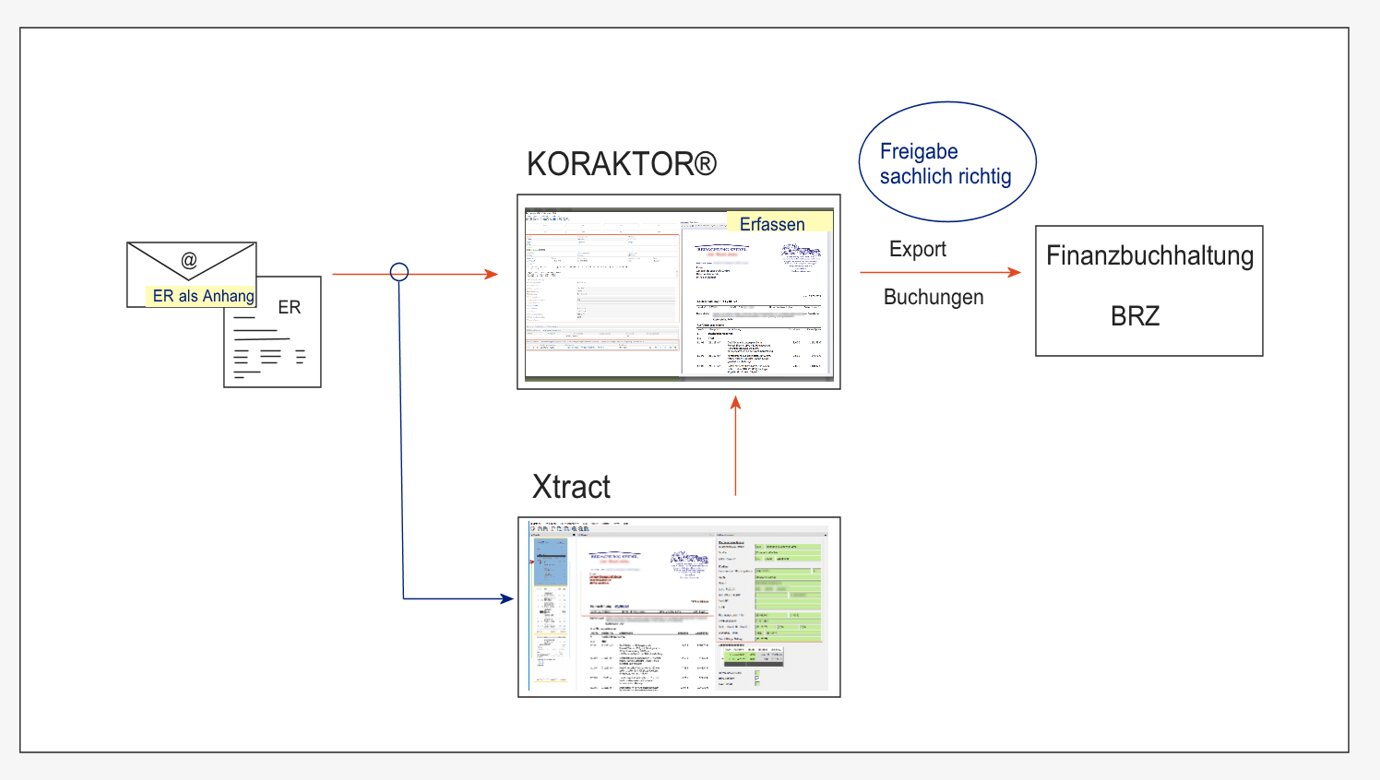 Durch die Digitalisierung der Belege und der damit verbundenen Erfassung der Daten mit Xtract ist die doppelte manuelle Erfassung nicht mehr notwendig, da die KORAKTOR® Schnittstelle Belegdaten an die Finanzbuchhaltung übergibt.