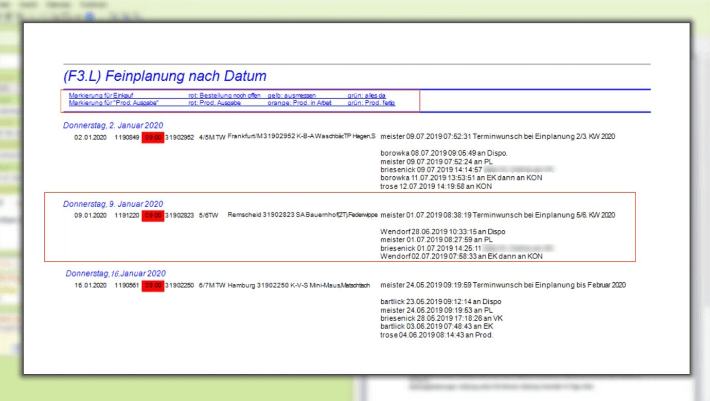 Dafür erfassen die Mitarbeiter die erforderlichen Daten im KORAKTOR®-Terminmodul. Diese werden in Termin-Listen für die Produktionsplanung aufbereitet und bereitgestellt. Die Mitarbeiter rufen dann bei Bedarf die entsprechende Liste aus dem Produktionsmodul auf und drucken die Auswertungen für den benötigten Zeitraum.