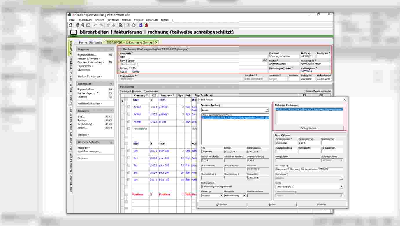 Aus einem Wartungsvertrag und einem auftragsbildenden Vorgang können periodisch fällige Wartungsrechnungen im MOS'aik erzeugt werden. Somit kann man die Vorgänge vom Angebot, über die Auftragsbestätigung bis zur Ausgangsrechnung übersichtlich verwalten.