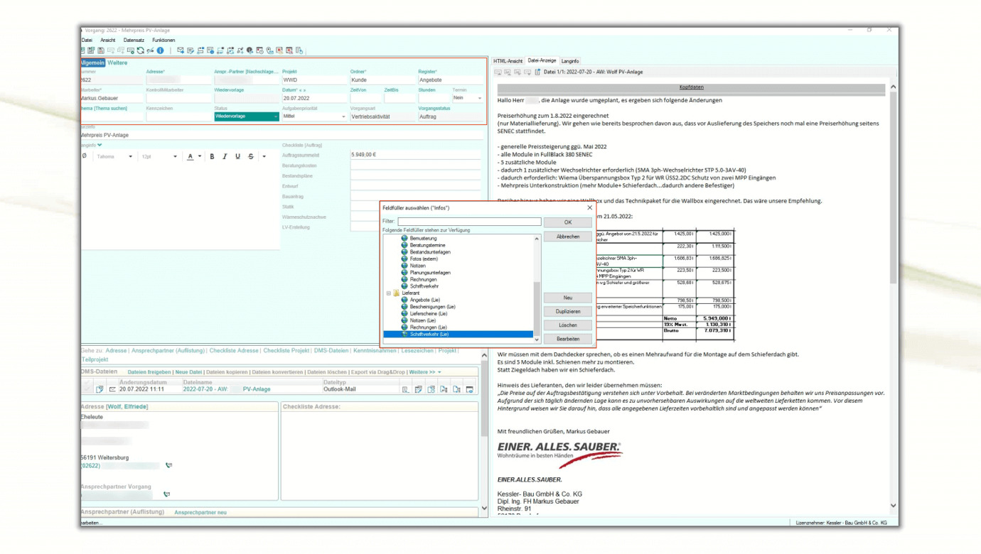 Informationen und damit verbundene Dokumente werden strukturiert in der elektronische Projektakte abgelegt. Dazu gibt es im Projekte-Arbeitsblatt entsprechend der Projektkoordination einfache, in Registern unterteilte Detailansichten. Durch den Einsatz von Feldfüllern kann man die Datensätze schnell dem jeweiligen Ordner und Register zuweisen. So werden die Geschäftsabläufe von der Auftragsbearbeitung sowie vom Vertrieb, die immer in der gleichen Art und Weise ablaufen und an denen verschiedene Mitarbeiter beteiligt sind, einheitlich abgebildet.
