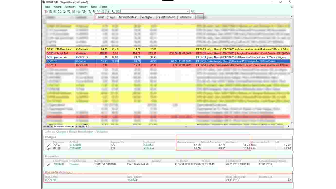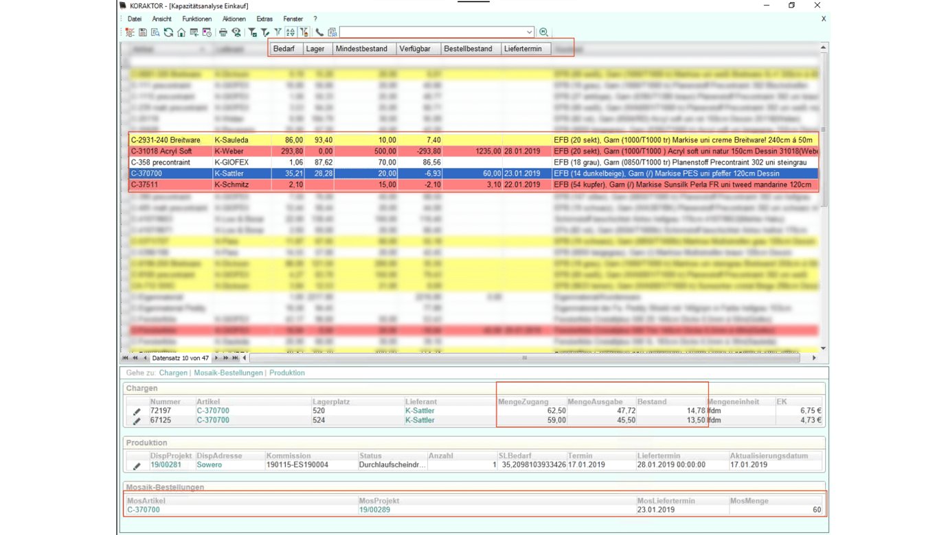 Die Kapazitätsanalyse zeigt die Daten zum Lagerbestand, Verbrauch und Bedarf - was für Entscheidungen im Bestellprozess sehr wichtig ist. Fehlende Stoffe für die Produktion kann man so schnell ermitteln, ebenso ist der Bestellstatus einfach zu verfolgen. Damit lassen sich die vielen individuellen Kundenwünsche besser erfüllen.
