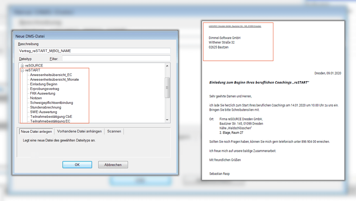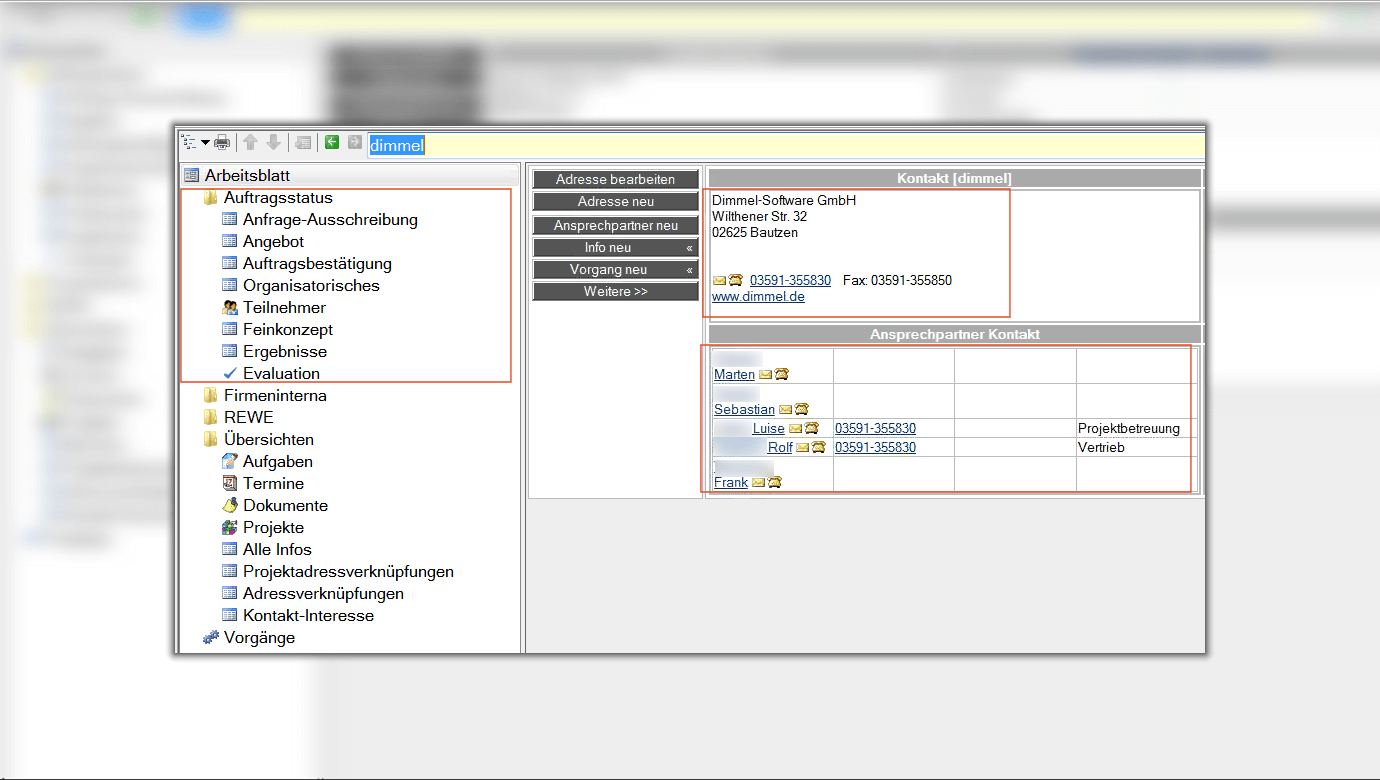 Wichtiger Bestandteil der KORAKTOR® Informations- und Adressverwaltung ist das Dokumenten-Management. Mit Hilfe von Dokumentenvorlagen und Platzhaltern lassen sich Verträge erstellen, automatisch ausfüllen und direkt in der Adressakte archivieren. Die Adressakte wurde für reSOURCE individuell zugeschnitten. Jedes Teammitglied hat Zugriff auf die Informationen, wenn er sie benötigt und ist jederzeit zu Projekten aussagefähig. Die bei den Adressen und Ansprechpartnern gespeicherten Telefonnummern werden zur computergestützten Telefonie genutzt - ein weiterer Rationalisierungseffekt.
