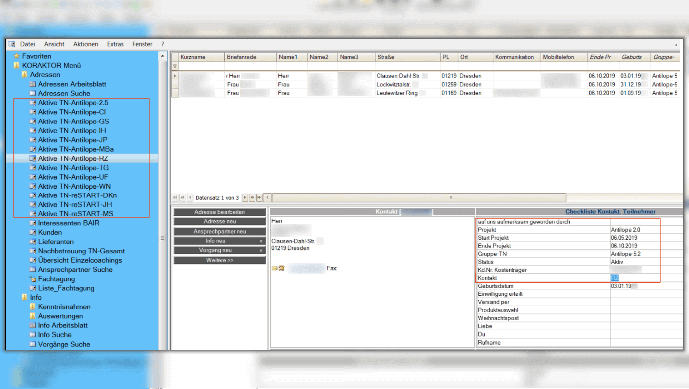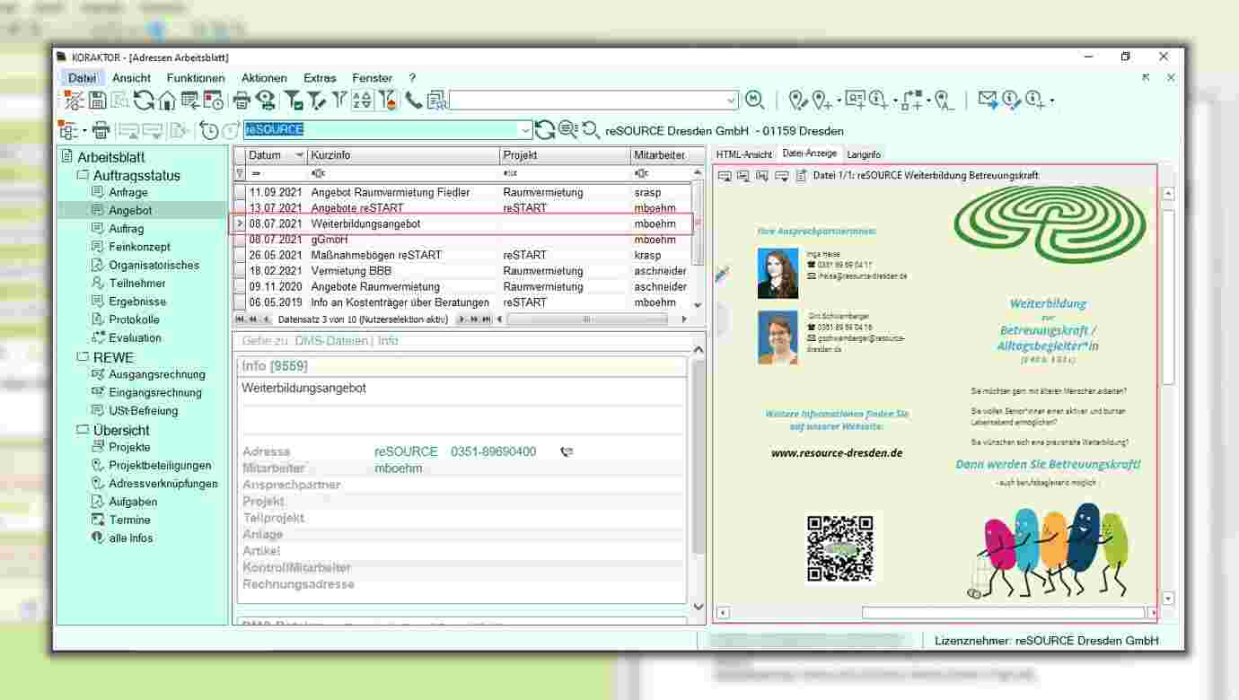 Seit vielen Jahren ist die reSOURCE Dresden GmbH Ansprechpartner für Trainings- und Coachings für berufstätige und arbeitssuchende Menschen. Arbeit menschlich machen ist das, was das Team von reSOURCE täglich bewegt. Die KORAKTOR®-Adressakte vereinfacht den Überblick, die Aktualisierung und den Zugriff auf die vielfältigen Kontaktdaten.