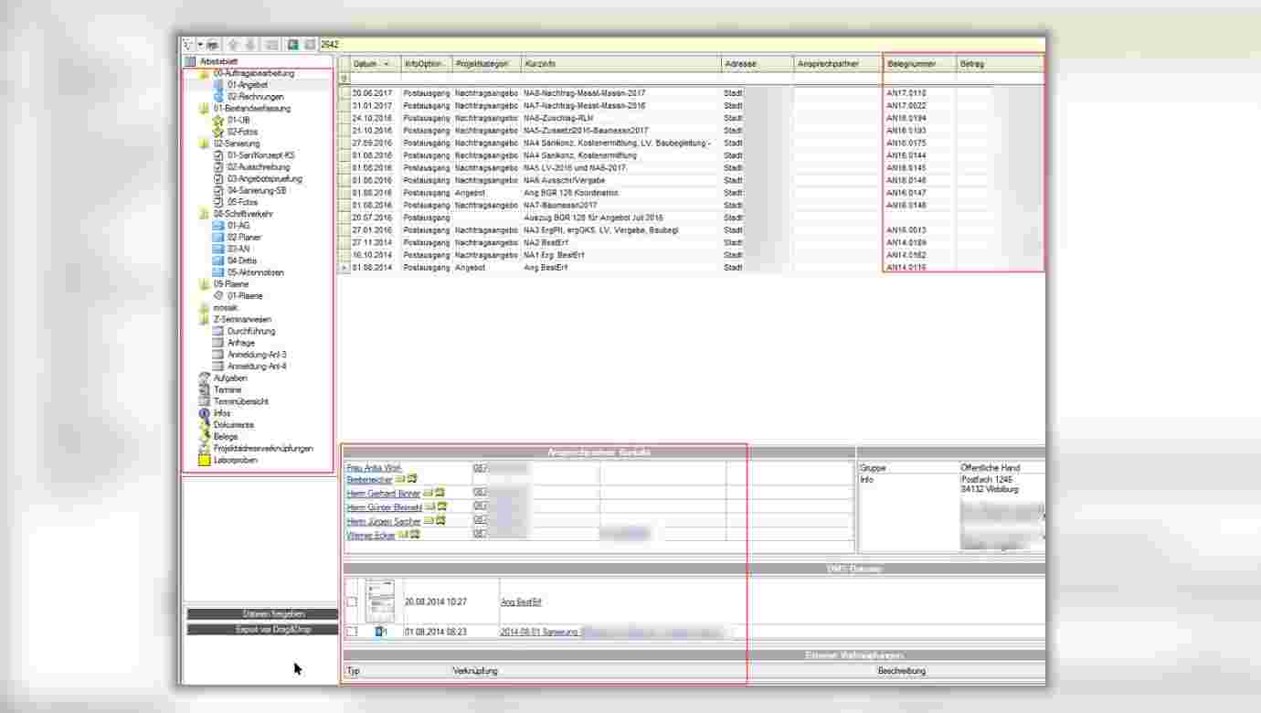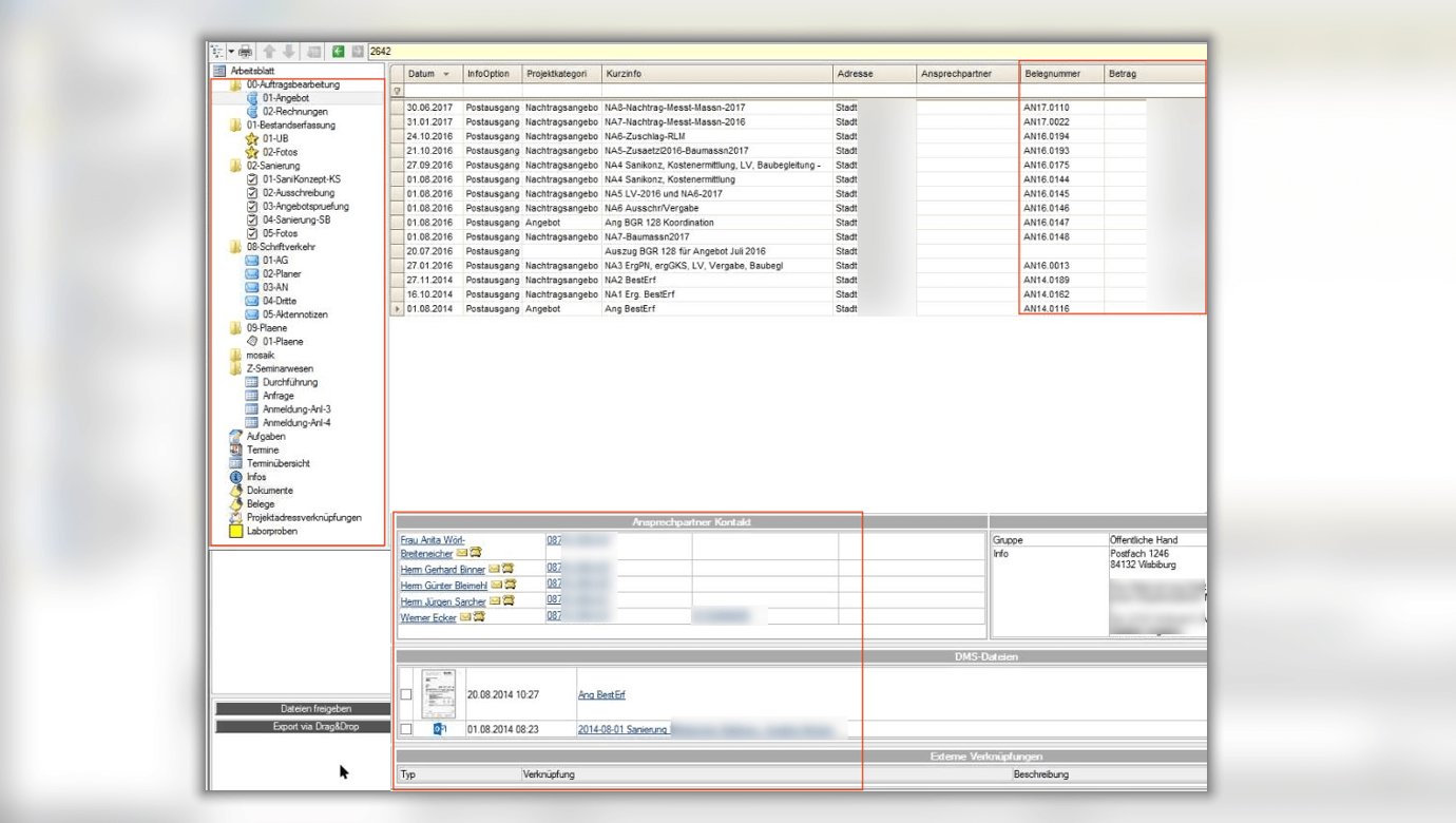 Aus dem angebundenen ERP-System MOS´aik übernimmt KORAKTOR® wichtige kaufmännische Belege (Kalkulationen, Angebote, Auftragsbestätigungen sowie Rechnungen) in die Projektakte.