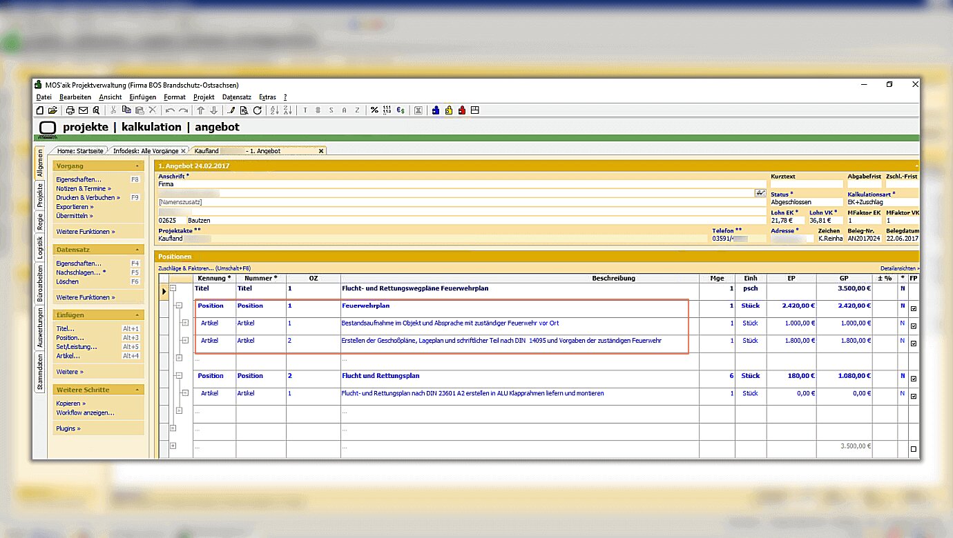 Mit der Einführung der Software MOS'aik wird der komplette Auftragsdurchlauf im Dienstleistungsunternehmen unterstützt und mit geringem Aufwand verwaltet. BOS Brandschutz-Ostsachsen hat sich dazu einen eigenen Artikelkatalog aufgebaut und auch Artikeldaten von Herstellern aus Excel-Tabellen in MOS'aik importiert. Auf dieser Grundlage kann man Angebote sehr effektiv und sicher erstellen. Ein besonderer Vorteil ist die Zusammenfassung von beliebigen Artikeln zu einer Angebotsposition.