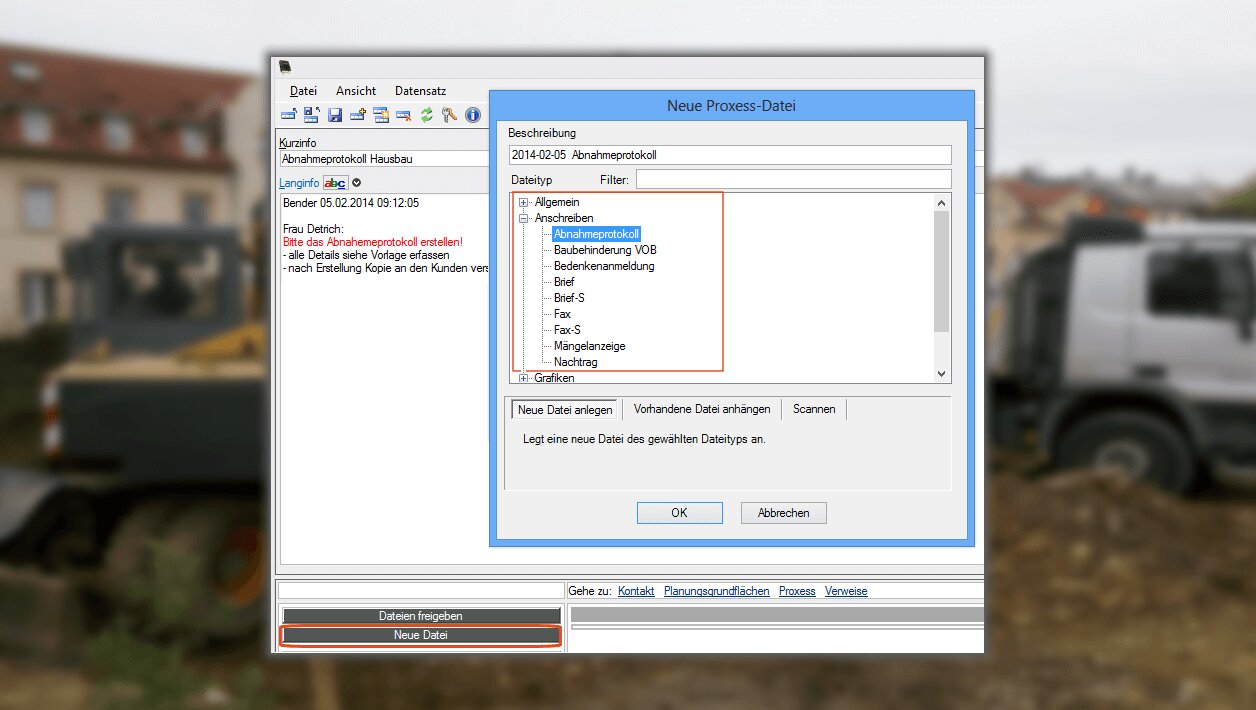 Das Informationssystem und die vollständige Archivierung aller wichtigen Dokumente sind wesentliche Bestandteile der Verwaltungssoftware für den Hausbau. Die zuordnung der Dateien erfolgt zur Kunden- oder Lieferantenadresse und zum dazugehörigen Bauprojekt. Dadurch werden alle Informationen, Dokumente und Belege sowie E-Mails schnell gefunden. Die Nutzung von firmenspezifischen Vorlagen in der Verwaltungssoftware sorgt bei der Erstellung von Dokumenten für einheitlichen Schrift- und Mailverkehr im Prozess des Hausbaus.