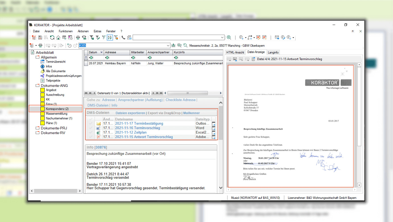 Die bei der Wohnungswirtschaft anfallenden Dokumente werden in der KORAKTOR®-Projektakte organisiert. Die elektronische Akte sorgt dafür, dass die Ablage der Dokumente in einer einheitlichen Ordnung erfolgt: