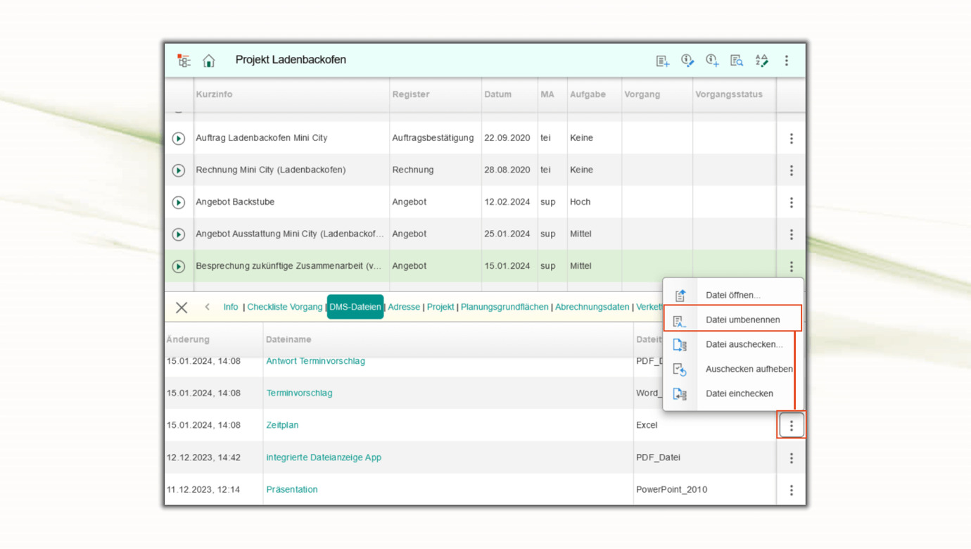 Den Namen einer archivierten Datei kann man über die in der DMS-Sektion hinterlegten Funktionen ändern.