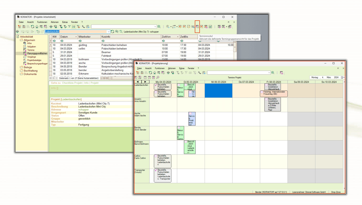 Über das Symbol "Terminmodul" kann man die definierte Termingruppenansicht für das Projekt aufrufen.
