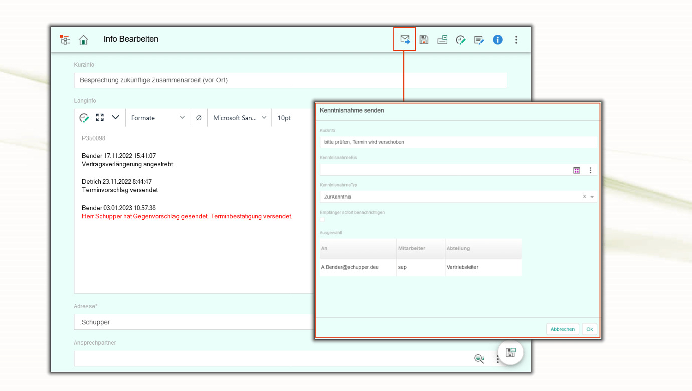 Eine einfache und schnelle Zusammenarbeit ist mit Hilfe der Kenntnisnahme plattformübergreifend möglich [1]. Das sich öffnende Formular dient zur Angabe der Kurzinfo, des Empfängers und ggf. weiterer Informationen [2].