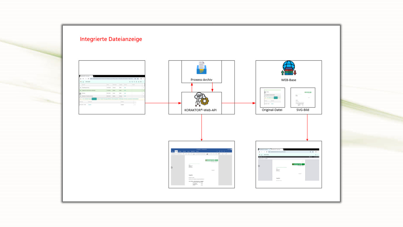 In der Basis-Ausführung der KORAKTOR®-App erfolgt der Zugriff auf eine Datei [1]. Diese Datei wird auf dem mobilen Endgerät geladen [2]. Die Anzeige erscheint im Browser oder Anwendungsprogramm [3]. Durch den Einsatz des Zusatzmoduls WEB-Base [4] verzichtet man auf den Download. Ressourcenschonend sieht man die Datei sofort im Browser [5].