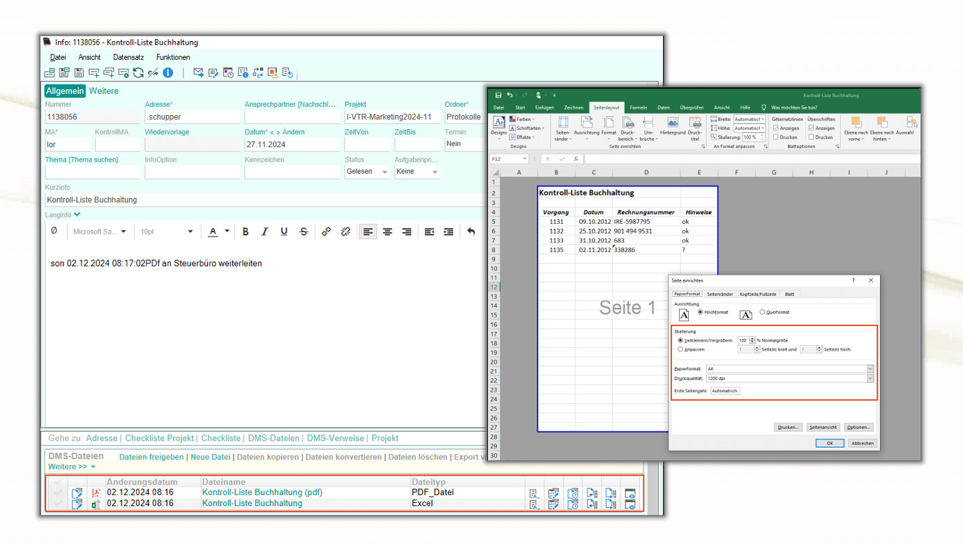 Die Exceltabelle ist für die Konvertierung und damit das gewünschte Ausgabeformat einzurichten. Das beginnt mit der Festlegung des Druckbereiches [1].Bei Bedarf kann man die Skalierung ändern und das Papierformat einstellen [2].Im Datensatz wird das erstelle PDF archiviert [3].