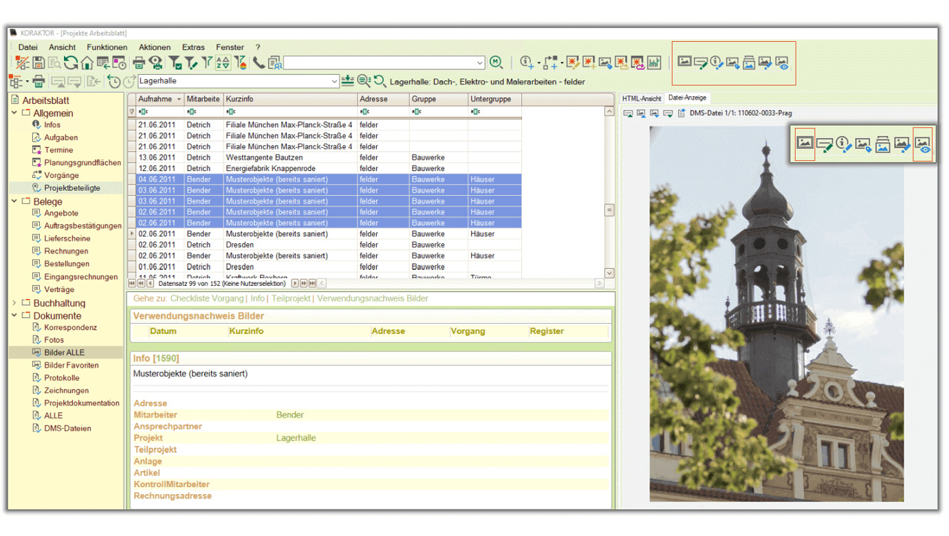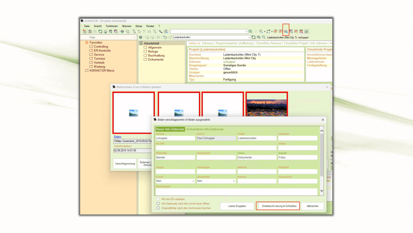 Das überarbeitete Bildarchiv gestaltet die Arbeit mit Bildern in KORAKTOR® noch einfacher und effektiver. So wurde die manuelle Verschlagwortung erweitert und vereinfacht z.B. für 3D-Bilder oder CAD-Dateien. Ausgewählte Bilder kann man jetzt direkt aus der Akte exportieren.
