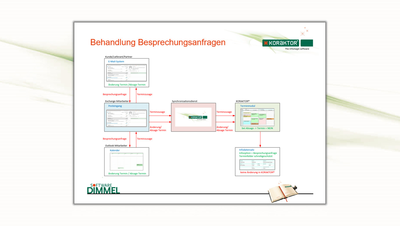 Zwischen den Systemen erfolgt ein bidirektionaler Datenaustausch [1]. Mit Hilfe des Synchronisationsdienstes wird die Besprechungsanfrage in KORAKTOR® übernommen und ist im Terminmodul bereits an der Farbe erkennbar [2]. Änderungen oder Absagen sind im Outlook möglich [3].