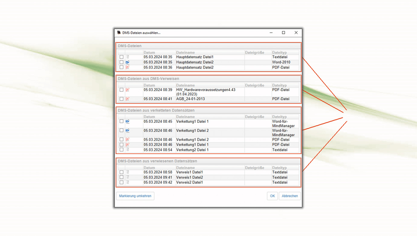 Der Senden-An-Dialog ermöglicht nun auch, Dateien aus Verweisen einzubeziehen. In der jeweiligen Sektion wählt man aus, welche Dateien aus welchem Datensatz versendet werden.
