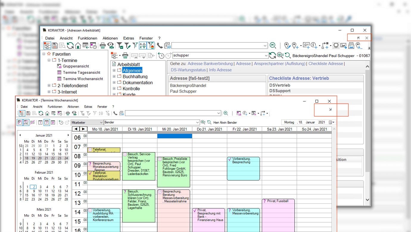 Mit Hilfe des Synchronisationsdienstes wird die Besprechungsanfrage in KORAKTOR® übernommen und ist im Terminmodul bereits an der Farbe erkennbar.