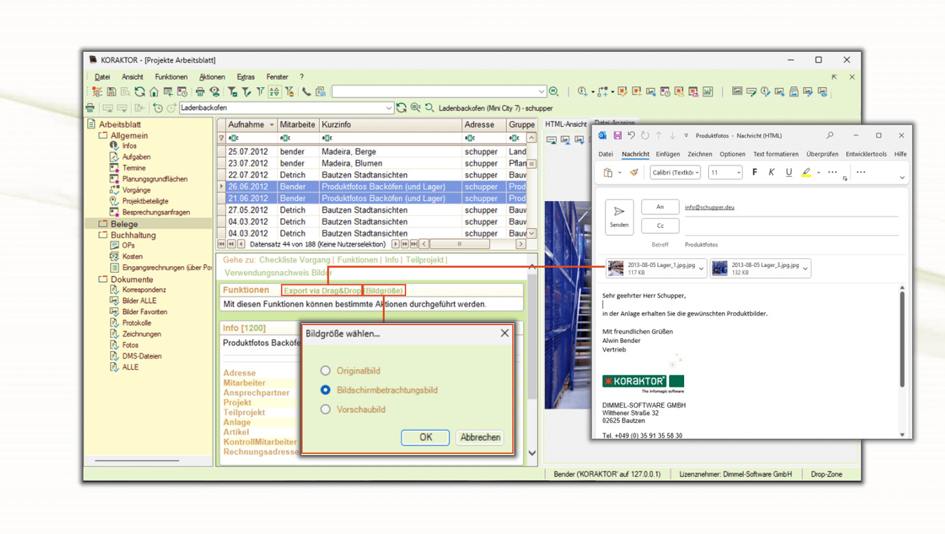 Ausgewählte Bilder kann man direkt aus der Akte exportieren und dazu vorher die Bildgröße anpassen [1]. Die markierten Fotos zieht man anschließend z.B. in eine Mail, mit der sie versendet werden sollen [2].