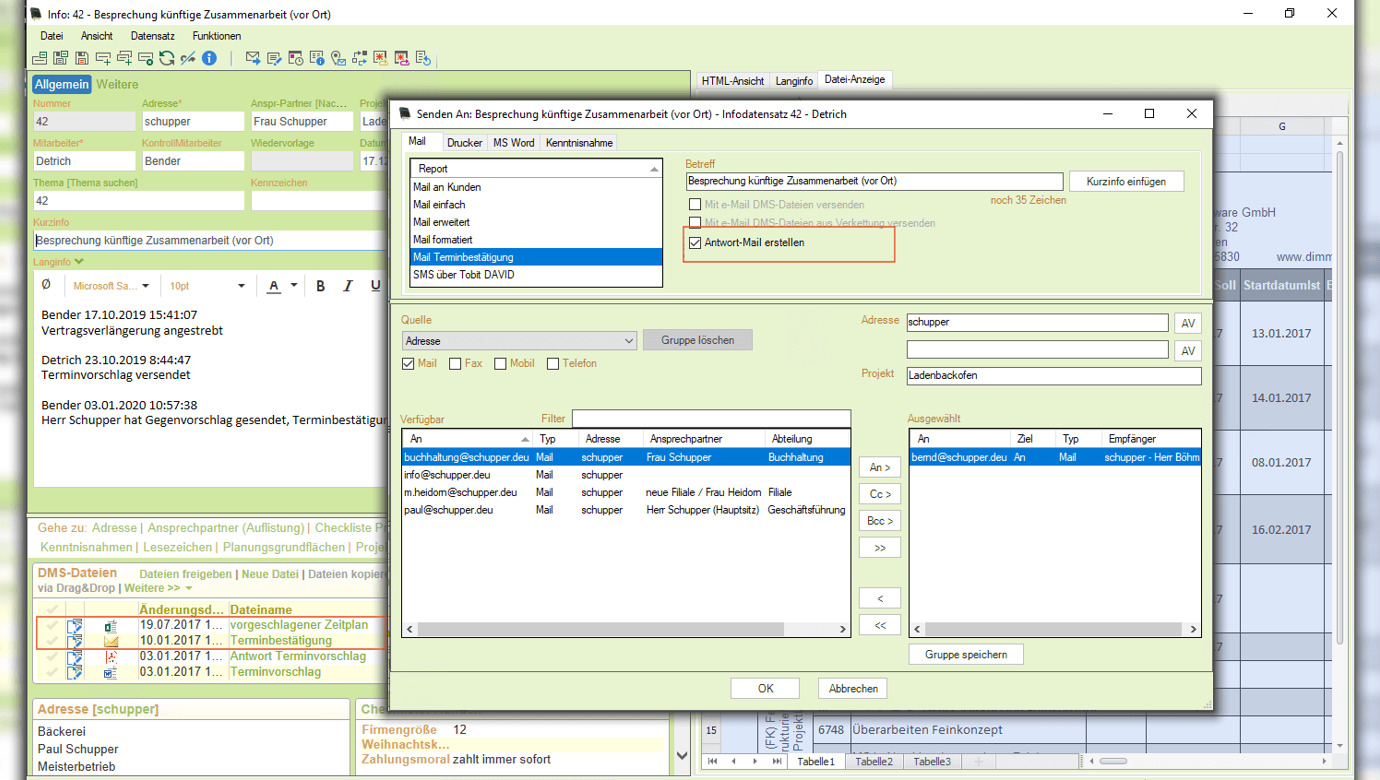 Um auch für den Mailverkehr aus KORAKTOR® den E-Mail-Verlauf zu erhalten, kann man im Sendungsdialog die Funktion "Antwort-Mail erstellen" aktivieren.