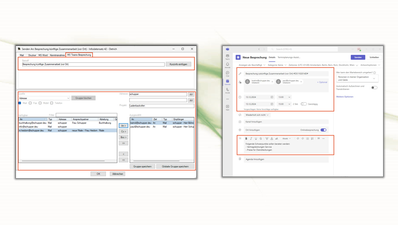 Wie beim Mailversand gewohnt, wählt man die Teilnehmer aus und mit Bestätigung [OK] ruft man die Besprechung in Teams auf.