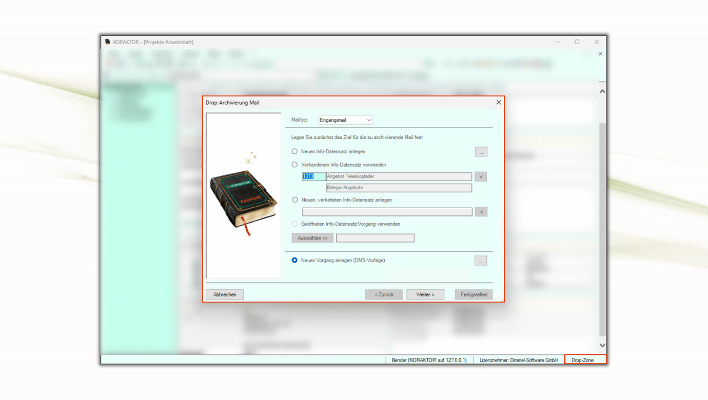 Die Mail aus Outlook zieht man in die Drop-Zone [1]. Der Assistent für die Direktarchivierung erscheint wie bisher und bietet die verschiedenen Optionen [2].