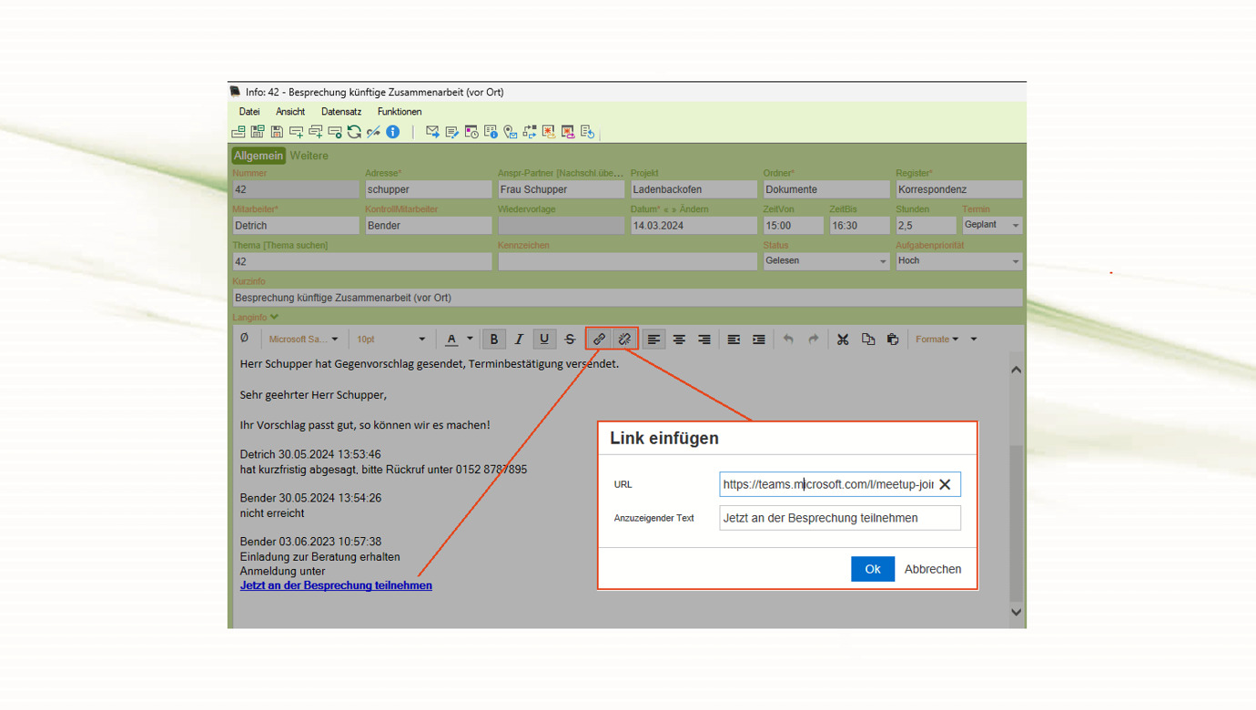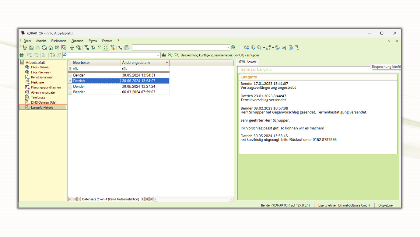 In der neuen Version erfolgte die Implementierung weiterer Anpassungen, die die Arbeit der Anwender erleichtern. Neben Planungsgrundflächen zeigt die Terminansicht auch Termine auf Basis von Infos oder auch Vorgängen an. Die Prozessdokumentation hat einen hohen Stellenwert - eine Langinfo-Historie macht die letzten Versionen der Langinfo nachvollziehbar. Des Weiteren kann man hier jetzt Links einfügen, bearbeiten oder löschen.