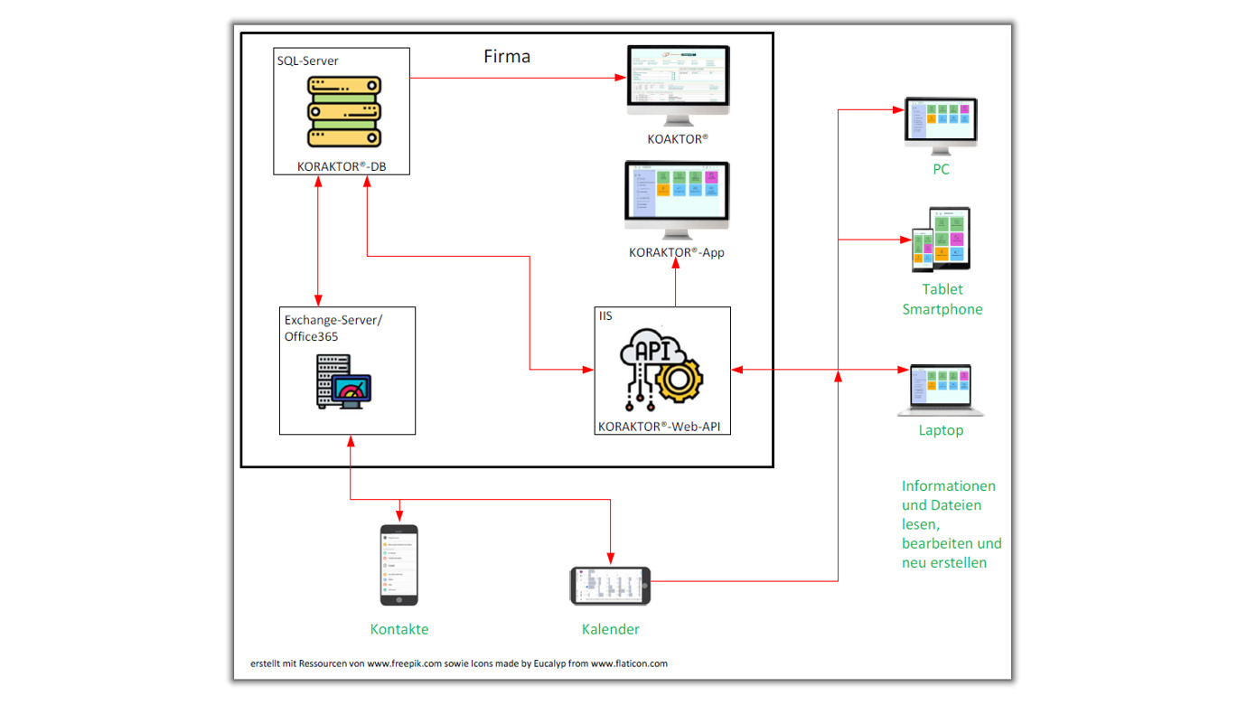 Daten und Dokumente sind zentral im Unternehmen gespeichert [1]. Der Synchronisationsdienst lädt Kontakte, Termine und Daten auf die mobilen Geräte [2]. Aus den Terminen der mobilen Geräte kann man die App direkt aufrufen und greift somit beim Termin online auf benötigte Informationen und Daten zu [3]. Über die KORAKTOR®- App kann man alle Infos und Dokumente abrufen, bearbeiten oder hinzufügen [4].