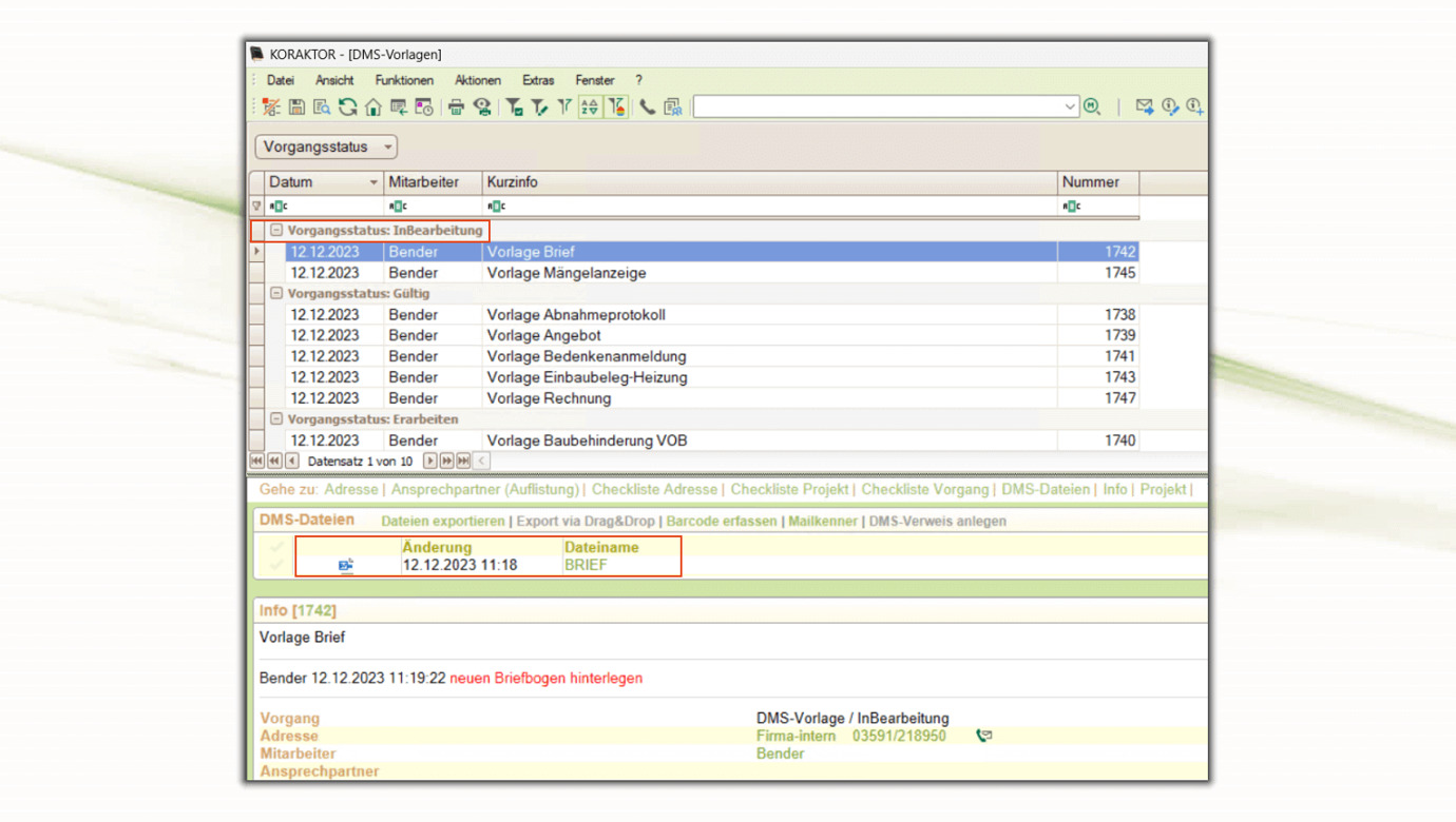 Der KORAKTOR®-Vorgang mit verschiedenen Status dient der Vorlagenverwaltung der unternehmensweit gültigen Dokumente [1]. Man erkennt sofort, in welchem Status sich die Vorlage befindet [2].